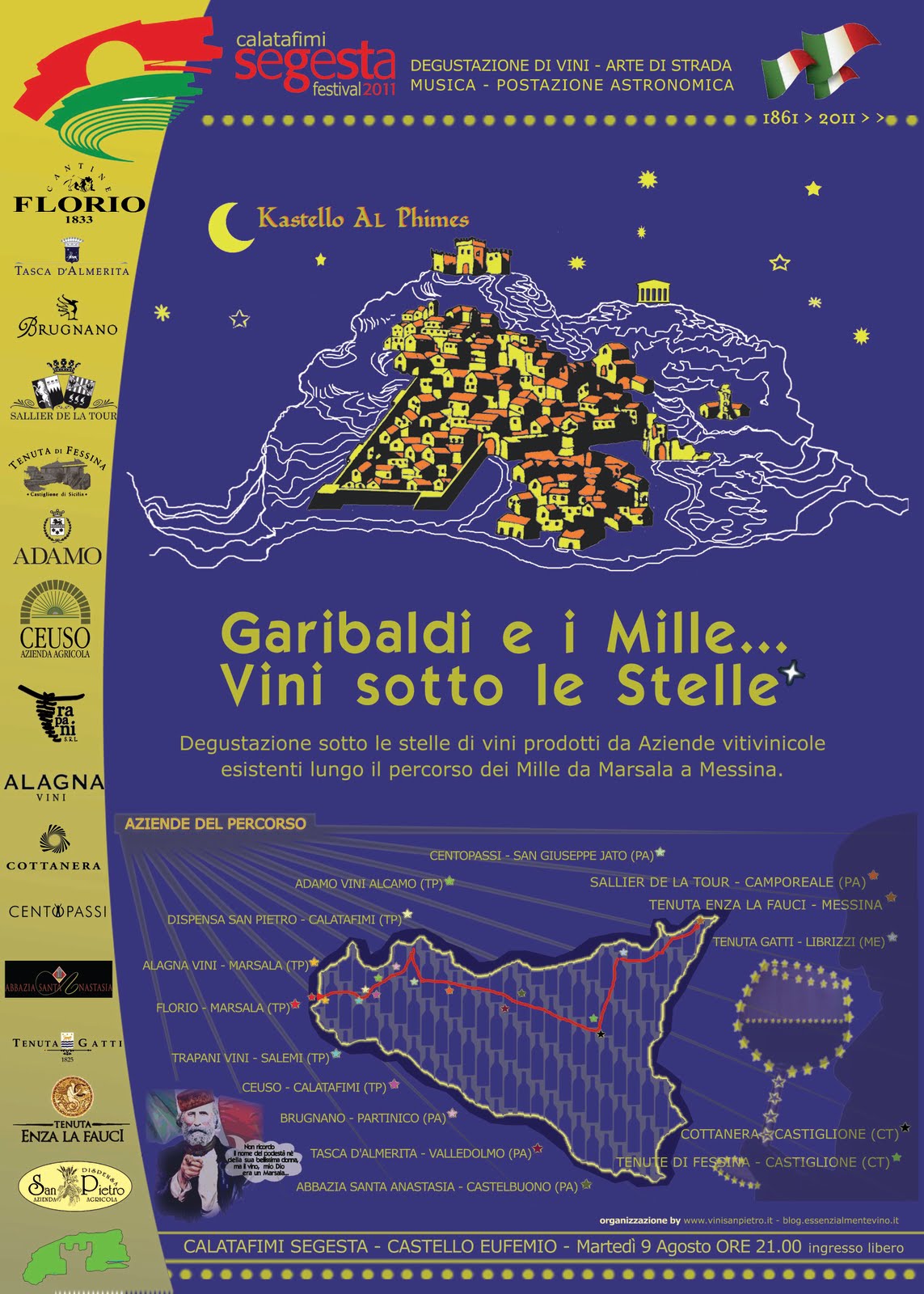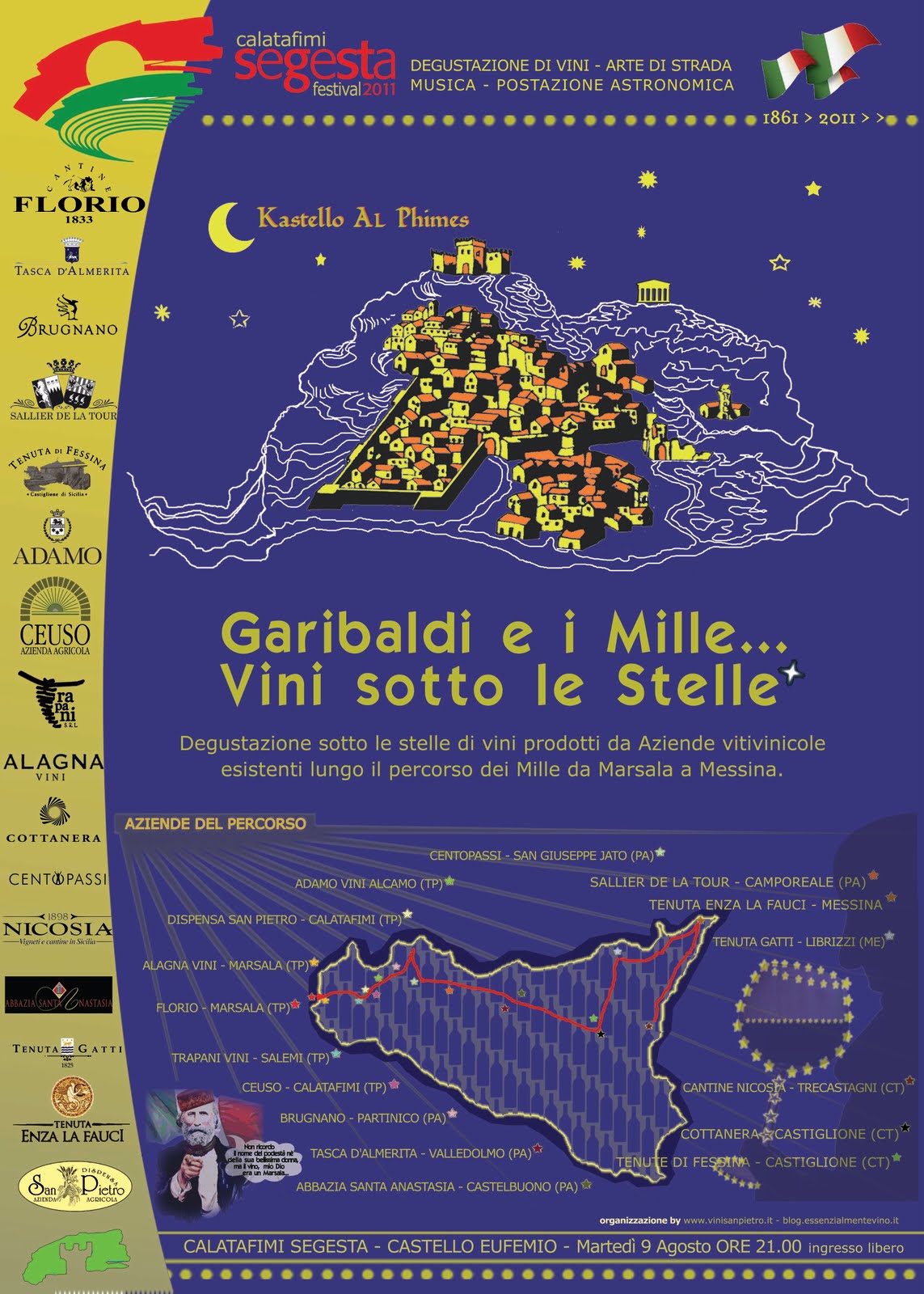 Nella ricorrenza del 150° anniversario dell’Unitàd’Italia, il CalatafimiSegesta Festival 2011 siveste di tricolore ed apre le porte ai vini del nostro territorio dedicando unaserata alla degustazione di vini prodotti lungo le strade percorse dai Mille con Garibaldiin Sicilia (Storia della Spedizione – qui –qui).