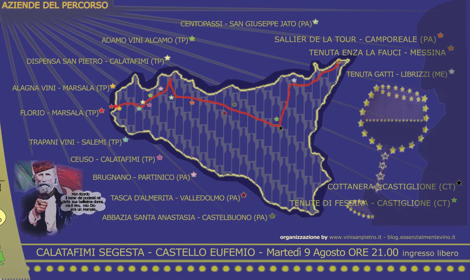 Si è pensato bene di abbinare ad ogni tappa del percorso chefecero i Mille una cantina di quei stessi territori ove la presenza delleggendario Generale innescò sommosse e movimenti popolari che diedero ungrande impulso alla conquista della Sicilia.